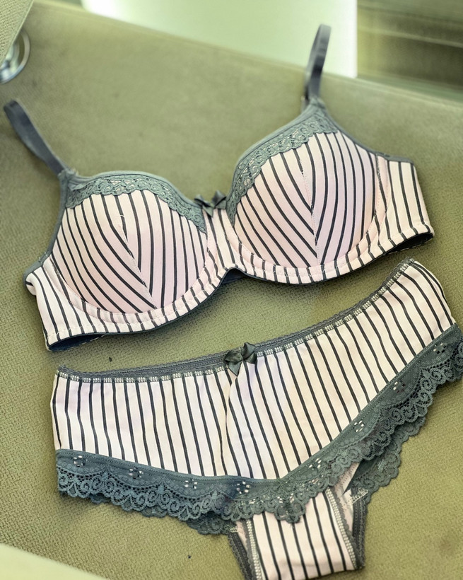 ست شرت و سوتین زنانه نخی راه راه کاپ نازک نخ پنبه طوسی صورتی فنر دار